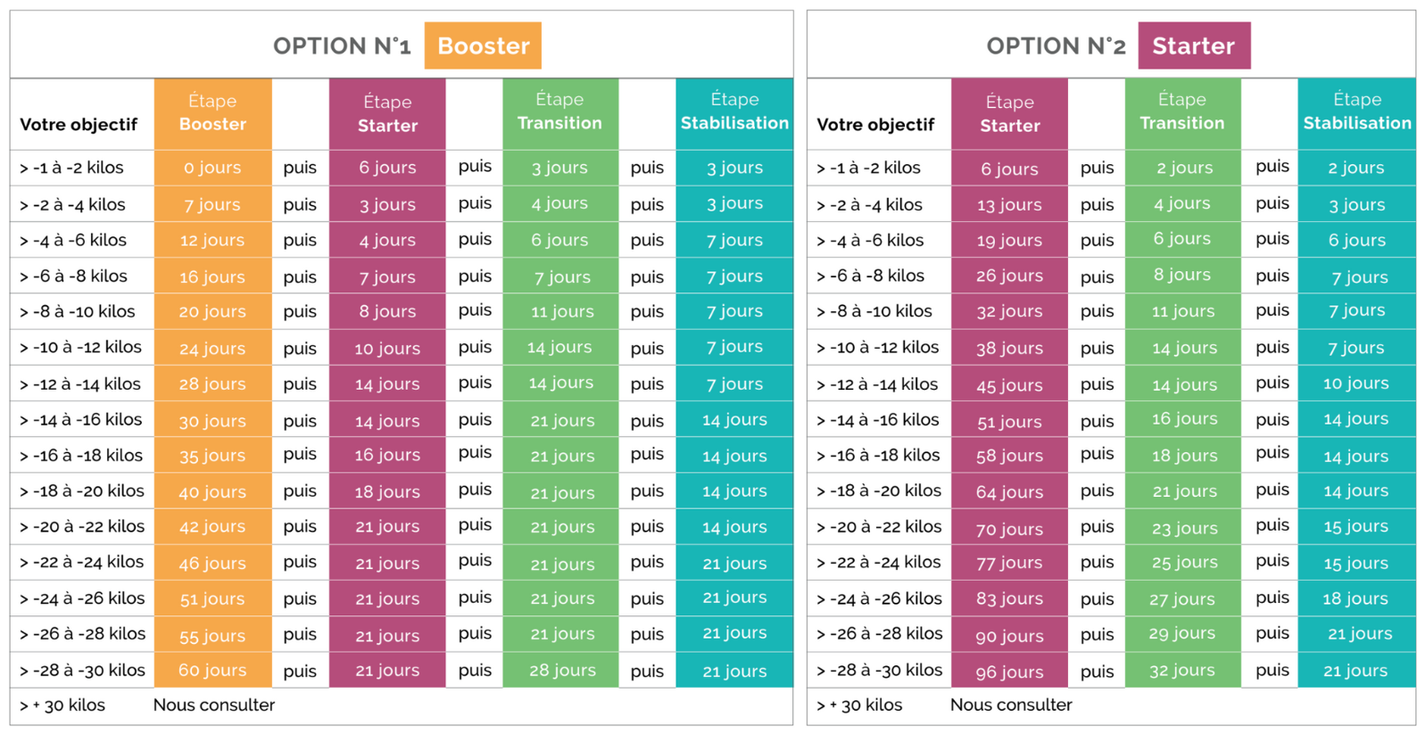 - Vous débuterez votre régime par l'étape Booster, vous suivrez le programme de cette étape durant 24 jours, jusqu'à atteindre 70% de votre objectif de perte de poids.
